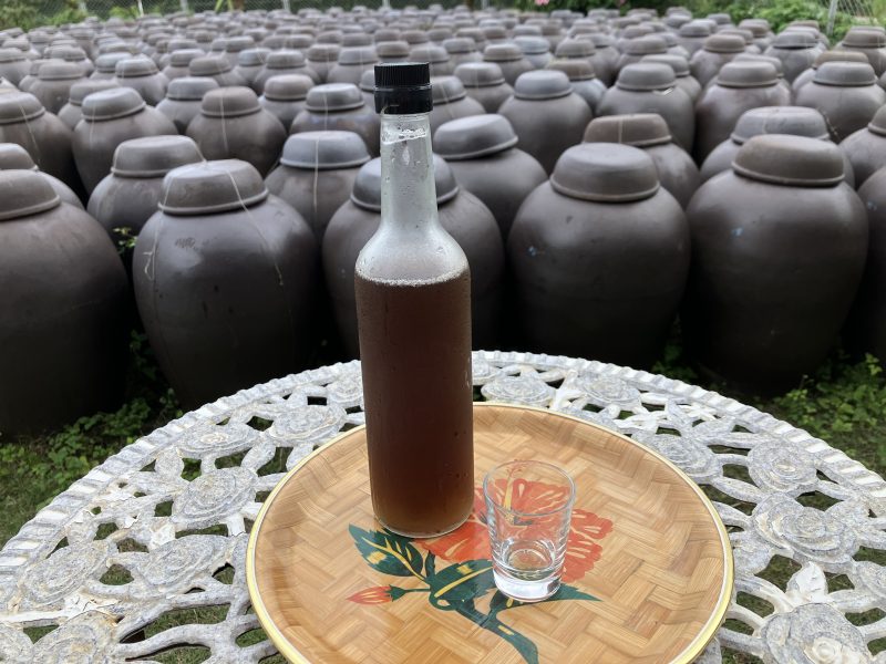 - 煮詰めた汁(黒糖に固まる直前の黒糖蜜)を壺に移し、仕込んでいく