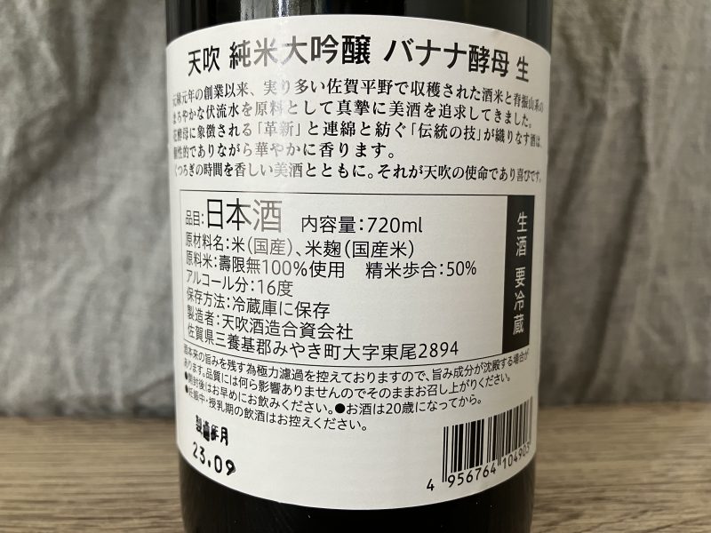 今回の日本酒は『天吹 純米大吟醸 バナナ酵母 生』。