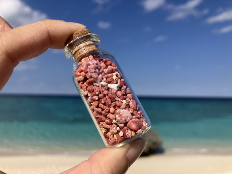 地道に採集した星の砂とピンク色のかけら達をボトルに入れたら完成です。