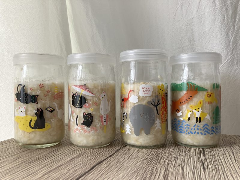 今まで集めた素敵なカップ酒の瓶は、主におやつ(甘酒やチーズケーキ、ゼリーなど)を入れるのに使っています。