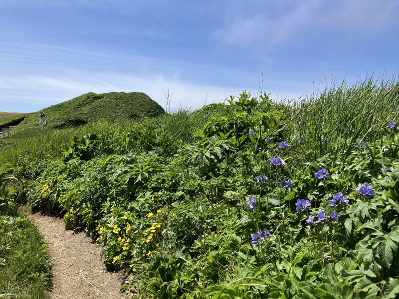 シーズン中は礼文島に咲くほとんどの花を見られるのが魅力で、更に天候のいい日には左手に海に浮かぶ姿が雄大な利尻山を臨むことができます。