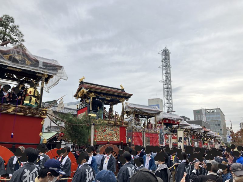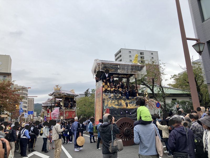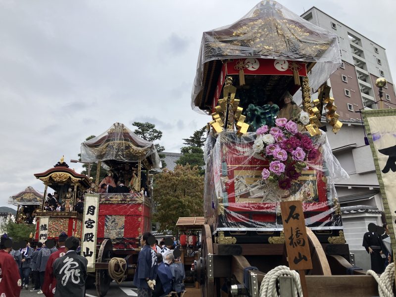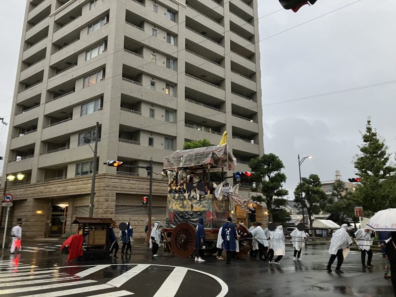 17:00前には雨だったこともあってか観光客はほぼ解散しており、地元の人々が山車を温かく見守る感じでアットホームな規模になっていました。