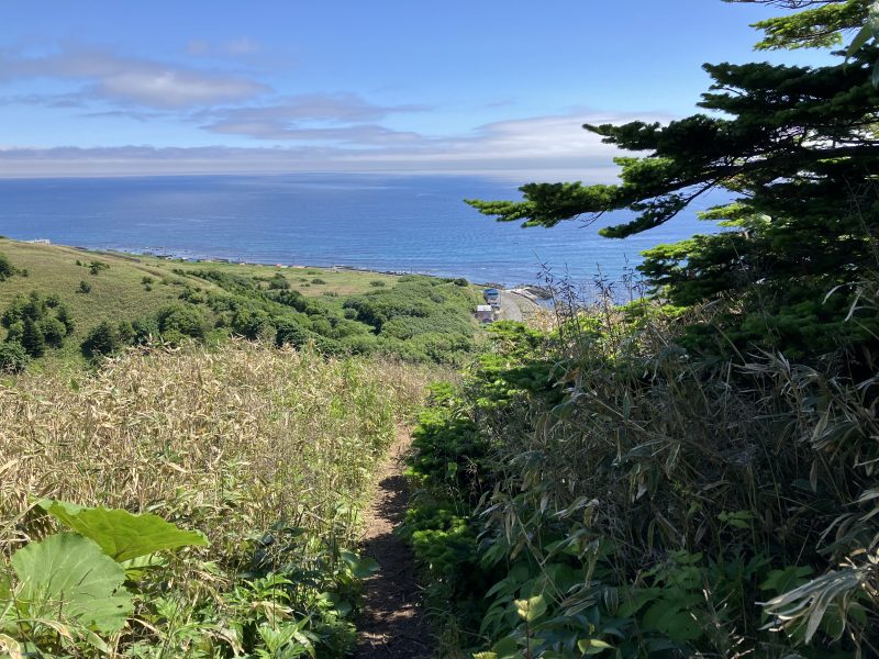 本州では標高1,000m後半~2,000m前半で見られる植生が、ここでは標高400m前後で見られるのだそう。急に景色が開けてスコトン岬の方角が見えました。