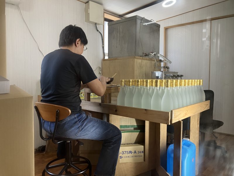 お酒造りだけでなく、ラベル貼りも人の手でひとつひとつ行われているんですね。 - 直火釜