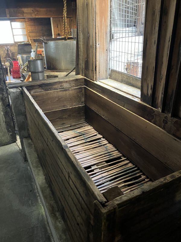 (奥に見えているのが直火釜です。)池原酒造所ではお酒造りに必要な器具はすべて創業当時から同じものを使い続けているとのこと。