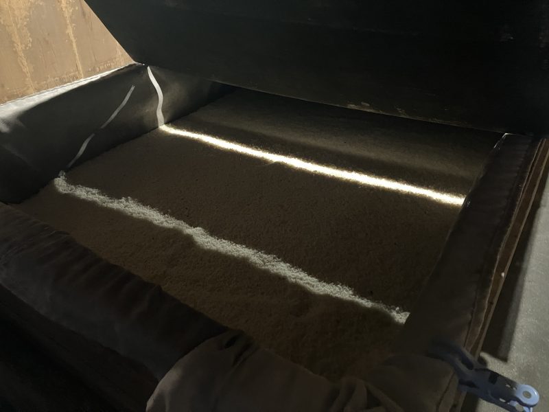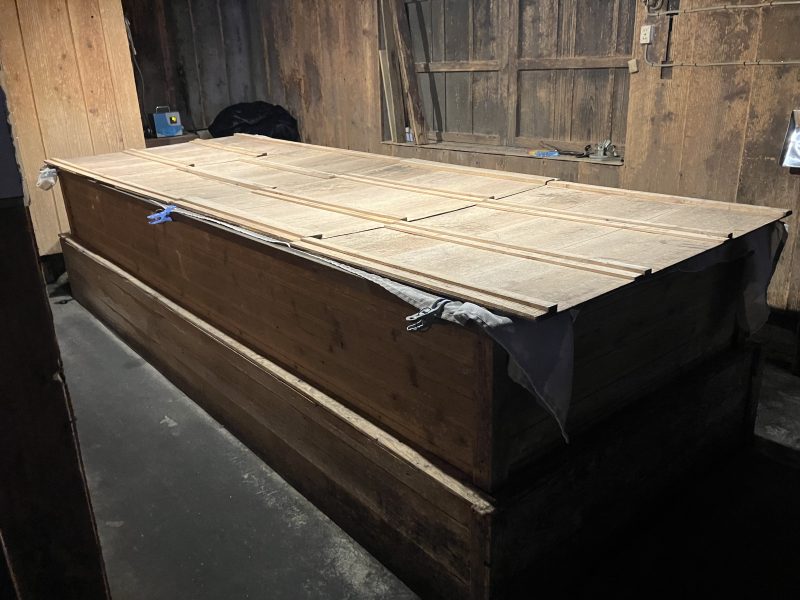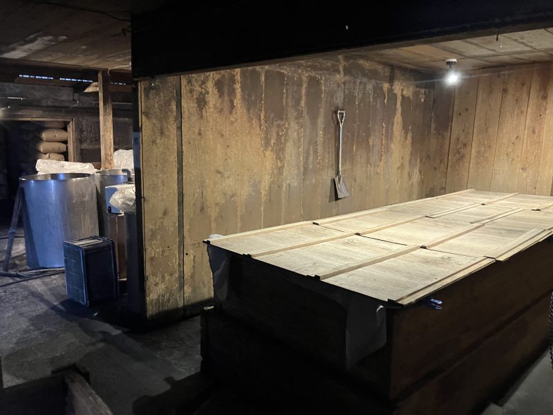 こちらではまさ黒麹菌の種付けが終わった米麹を寝かせているところで、ちらりとその様子を見せていただきました。