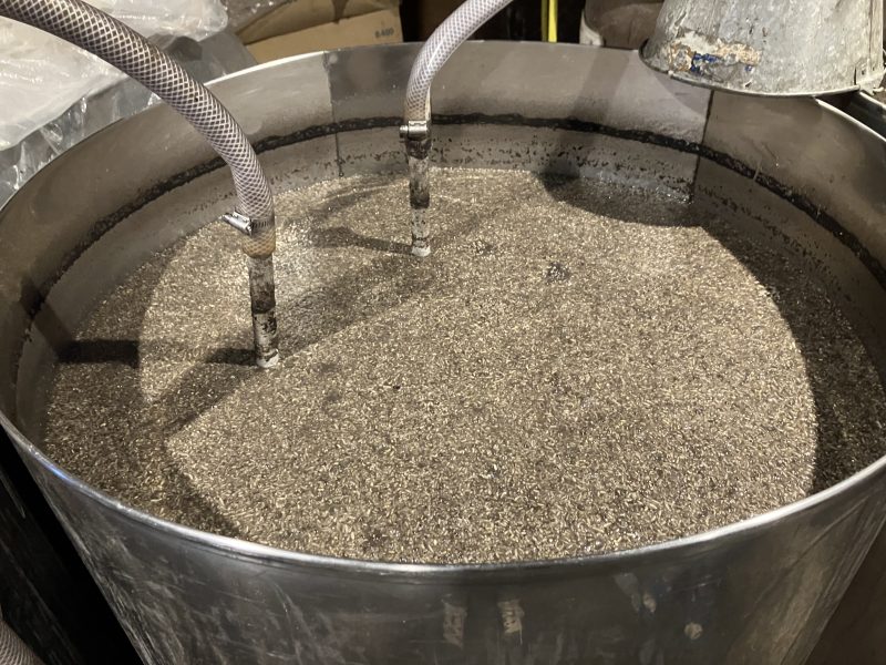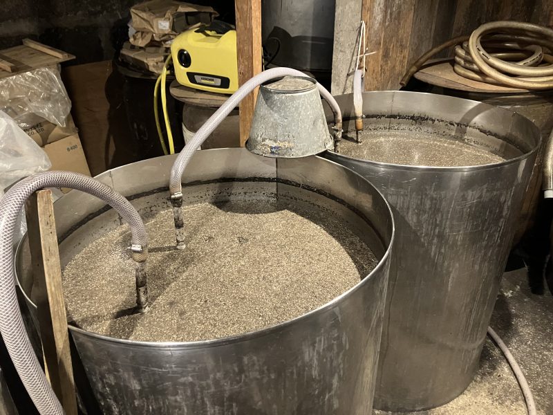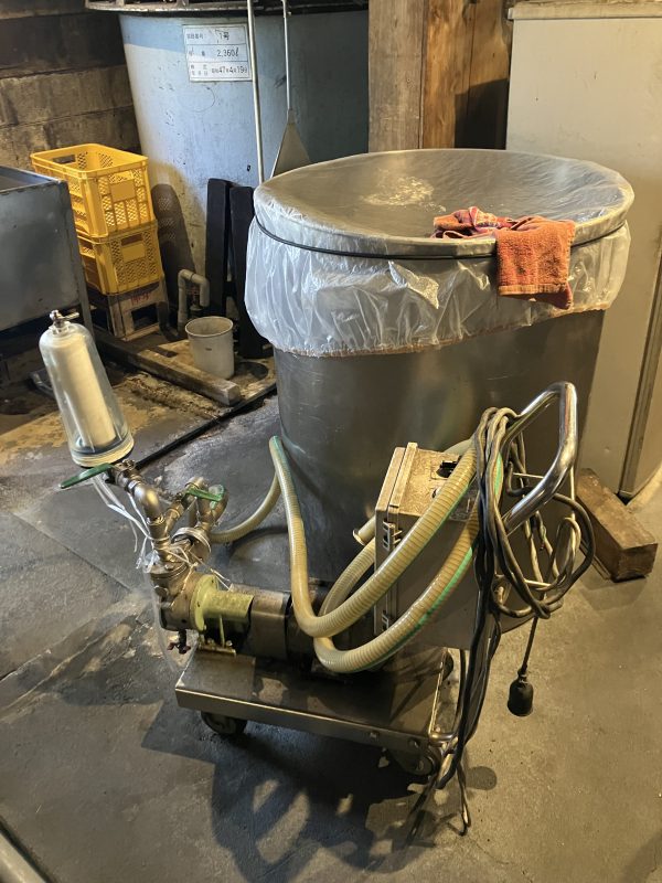 こちらは比較的最近仕込まれたもの。まだ少し水っぽい感じがあります。蓋もなし!フルオープンで発酵していました 続いて、更に奥にあるのは中理ドロッとした感じの醪。