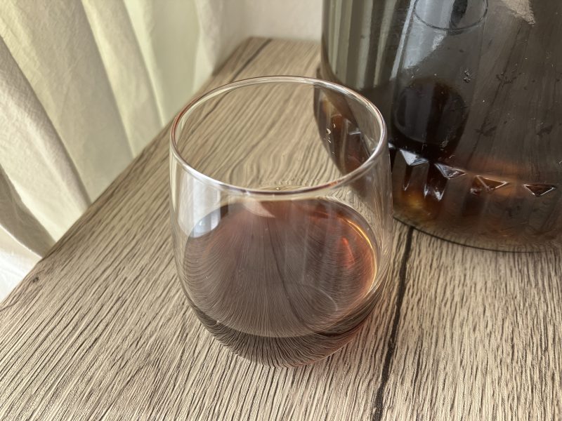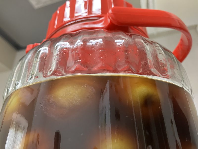 甘さ控えめに作った梅酒、のつもりでしたがしっかりと黒糖の濃厚な甘みたっぷりの梅酒が出来上がっておりました。