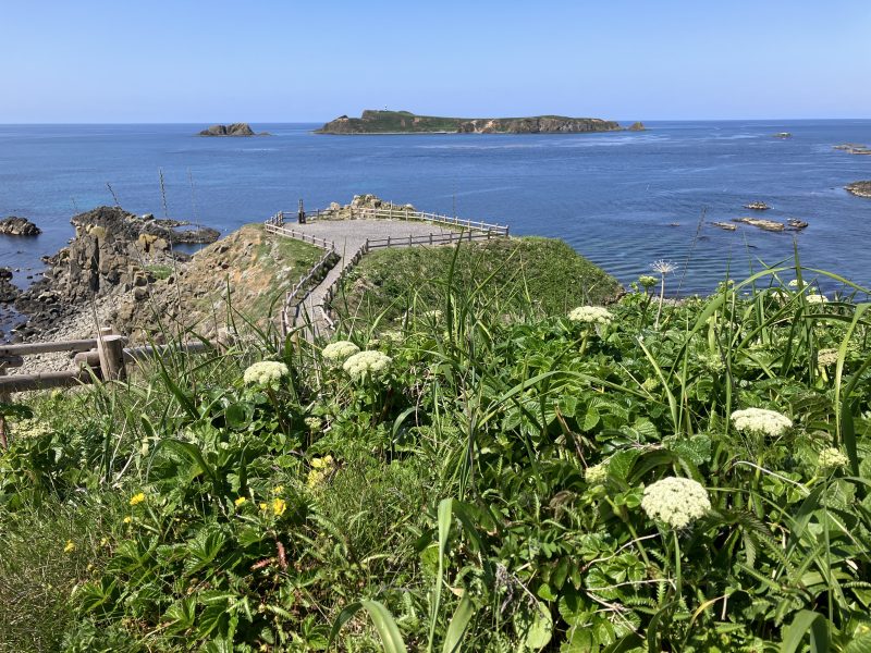 この白い花はスコトン岬周辺にたくさん咲いており、ぽつぽつと浮かぶ鮮やかな白がこの景色の中でとても映えていました。