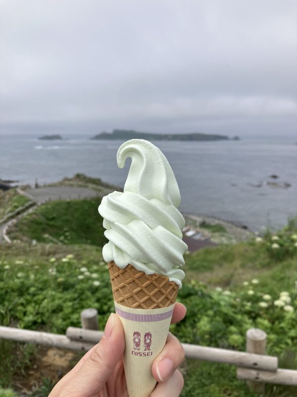 とある冷たい強風の日、島の人という売店で販売されているうっすら緑色の昆布ソフト(400円)を食べてみました。