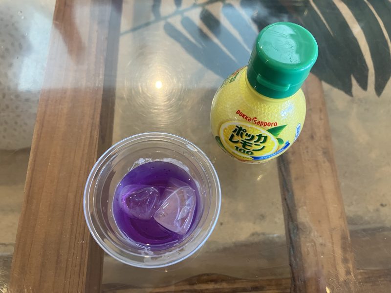 バタフライピーはもともとは青っぽい色をしていますが、レモン果汁を加えると紫っぽい色に変化します。